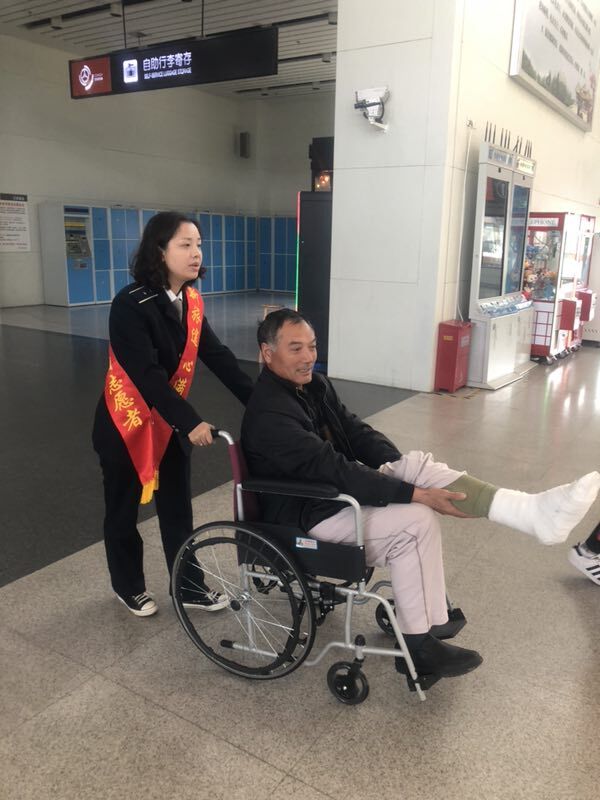 不一會兒,陪同的工友買好了當(dāng)天10:30分前往昆山的車票。高娟和另一位工作人員彭素青借來了輪椅,二人推著他來到了二樓發(fā)車檢票口,將他攙扶到座椅上坐好,并和發(fā)車班工作人員交接了尤師傅的情況,囑托他們多多照應(yīng),安排好一切后,高娟和彭素青才離開回到自己的工作崗位。尤師傅和工友都非常感謝揚州站工作人員細心周到的服務(wù)。