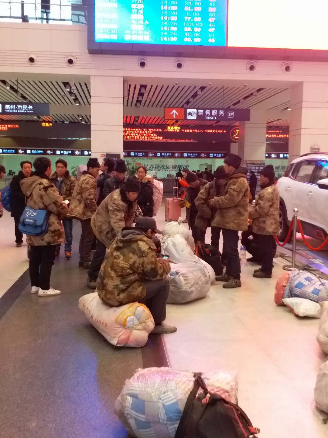 元月11日,天空中淅淅瀝瀝的小雨下個不停,搖曳的風(fēng)雨中挾著幾分寒意。下午一時許,揚州西部客運樞紐售票大廳東廣場門口,出現(xiàn)了二十幾位拖著、扛著行李,頂風(fēng)冒雨奔向售票大廳農(nóng)民工模樣的旅客。