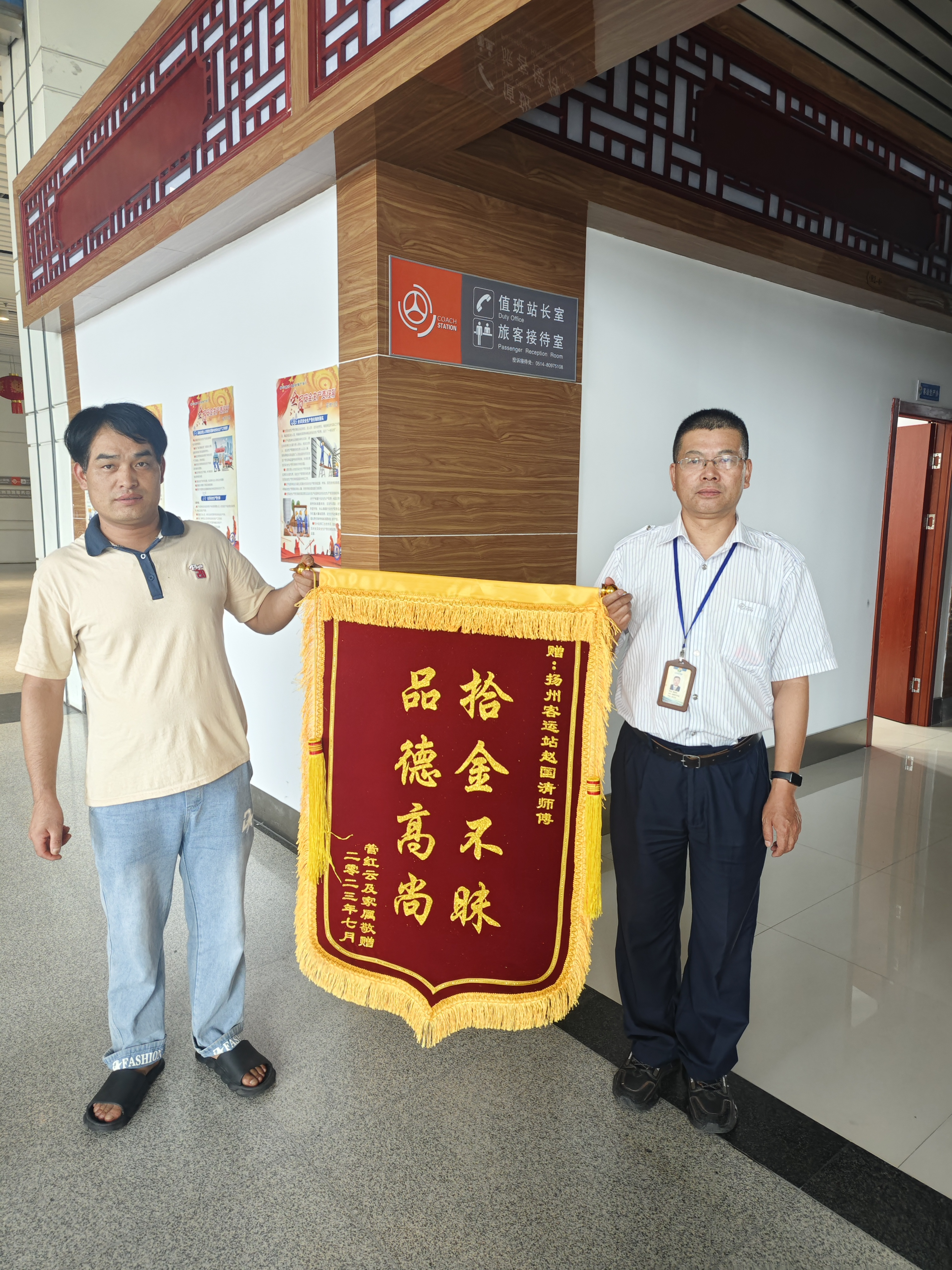 7月18日,失主管先生專門制作了一面“拾金不昧,品德高尚”的錦旗到揚(yáng)州汽車站值班室對(duì)好人趙國清表示感謝。接下來,揚(yáng)汽集團(tuán)站務(wù)中心將繼續(xù)以黨建為引領(lǐng),以榜樣為鏡,向榜樣看齊,充分發(fā)揮先鋒模范帶頭作用,深入推動(dòng)“星級(jí)服務(wù),溫馨之旅”黨建微品牌工作走深走實(shí)。