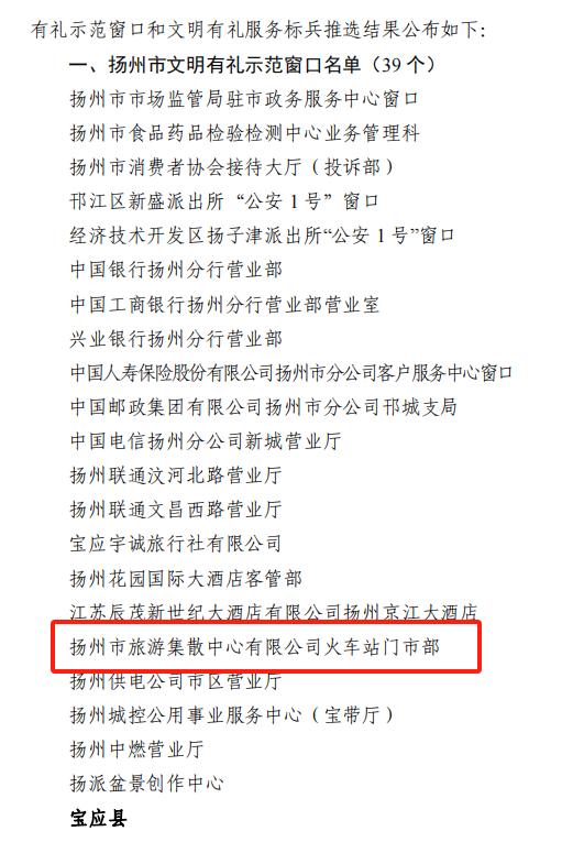 揚州旅游集散中心火車站門市部榮獲市“2023年度文明有禮示范窗口”榮譽稱號